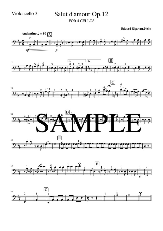 チェロ4重奏 譜面(1–4 Cello / 中級 ×2・初級 ×2) 永遠の名曲《パッヘルベルのカノン》を、 チェロ4本のために丁寧にアレンジしたアンサンブル譜です。 全パートにプロチェリストYoutuberネロがフィンガリング(指番号)を記載し、 アンサンブル未経験の方でも安心して取り組めるように仕上げました。 編成と難易度 1st Cello(中級) ヴァイオリンのメロディを担当。高音が出てきます。 2nd Cello(中級) ヴァイオリンのメロディを担当。高音が出てきます。 3rd Cello(初級) 高音で難しい箇所を1オクターブさげたり、難易度を下げてあります。 4th Cello(初級) オリジナルのチェロパートをベースに、飽きが来ないように少しメロディを入れてあります。 各パートの役割が明確で、 レベルの違うメンバーが一緒に演奏しても自然に音楽が成立するよう設計されています。 この楽譜のポイント フィンガリング付き:初心者でも迷わず練習可能 響きのバランス重視:チェロ4本で美しく成立する専用アレンジ レッスン・発表会・サークルに最適 特に 3rd・4th は音域も運指もやさしく、 初級者が参加しても本格的なアンサンブルが楽しめる内容です。 こんな方におすすめ 教室・サークルでのアンサンブル教材を探している先生 初心者〜中級者を含むグループで「名曲を美しく仕上げたい」方 発表会・ミニコンサートで演奏できる定番レパートリーが欲しい方